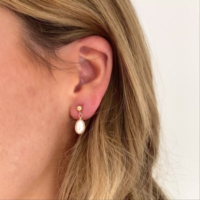 Our ball stud pearl earring with small pearl drop are meticulously crafted by hand using authentic freshwater pearls and premium metals in either 925 sterling silver or 14K gold filled.
